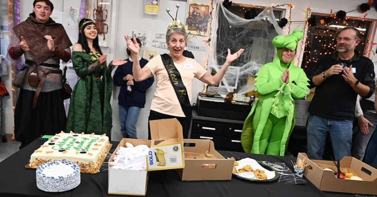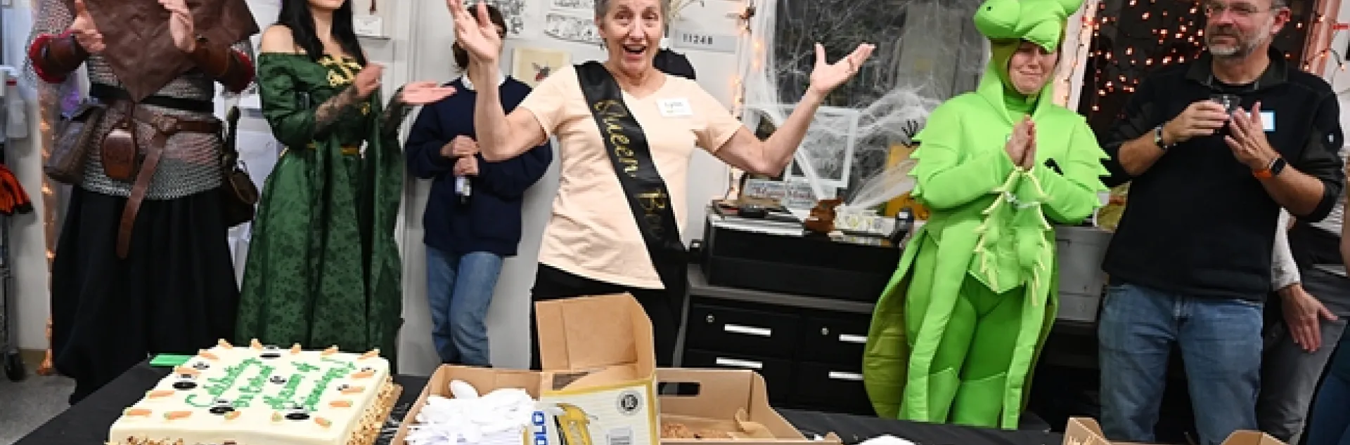 UC Davis entomology alumna Ivana Li, a biology lab manager at UC Davis, catered the event and arrived with her dog, Juniper, dressed as a taco. Lynn Kimsey cut a carrot cake, decorated with tiny carrots and large googly eyes. Forensic entomologist Robert "Bob" Kimsey, dressed in his ghillie suit, served beverages.