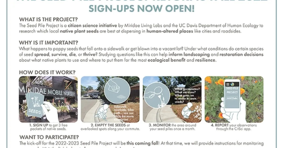 It works like this: "Community participants to drop small piles of local, California native seeds in urban areas where they live or work, then monitor the results through repeated observations," Krimmel said. "Using data from participants on the conditions under which certain species of these locally adapted seeds spread, survive, or die, we can gain a better understanding of which native species to incorporate into the built environment and where to put them for the greatest ecological benefit and resilience."