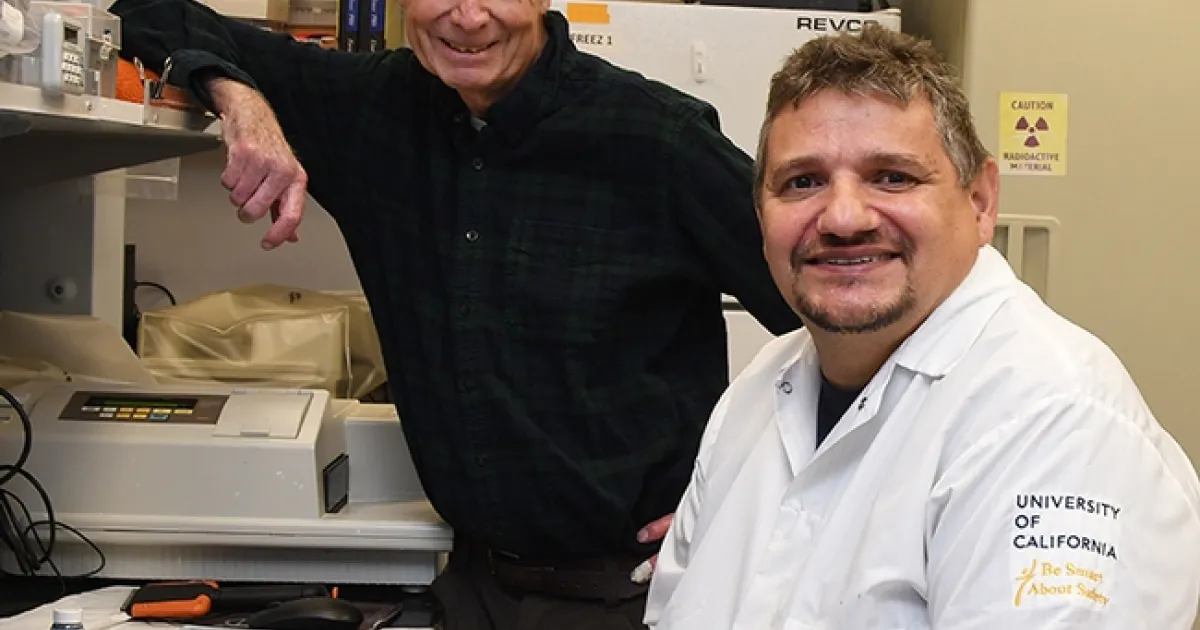 UC Davis distinguished professor Bruce Hammock (left) and researcher Christophe Morisseau of the Hammock lab are part of the "click-chemistry" team that won an international award from the Royal Society of Chemistry. (Photo by Kathy Keatley Garvey)