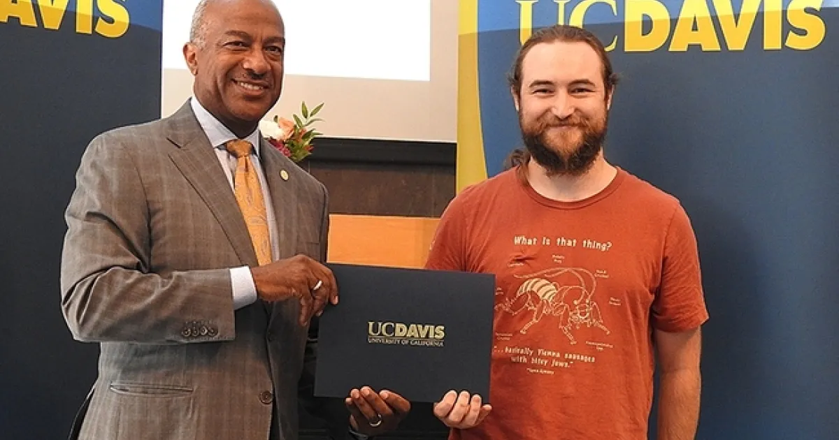 UC Davis Chancellor Gary May congratulates award recipient Brennen Dyer of the Bohart Museum of Entomology. (Photo by Kathy Keatley Garvey)