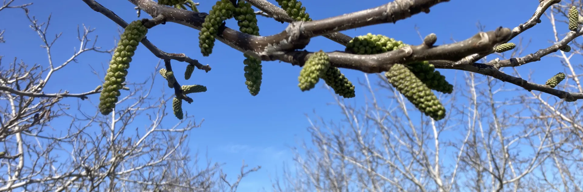 Devices called tensiometers are being installed in this walnut orchard in Contra Costa County. The devices will help researchers in the UC Davis Department of Plant Sciences develop more efficient irrigation methods for California’s walnut industry. The buds shown here are male flowers called catkins, which produce pollen. (Kamyar Aram/UC ANR)