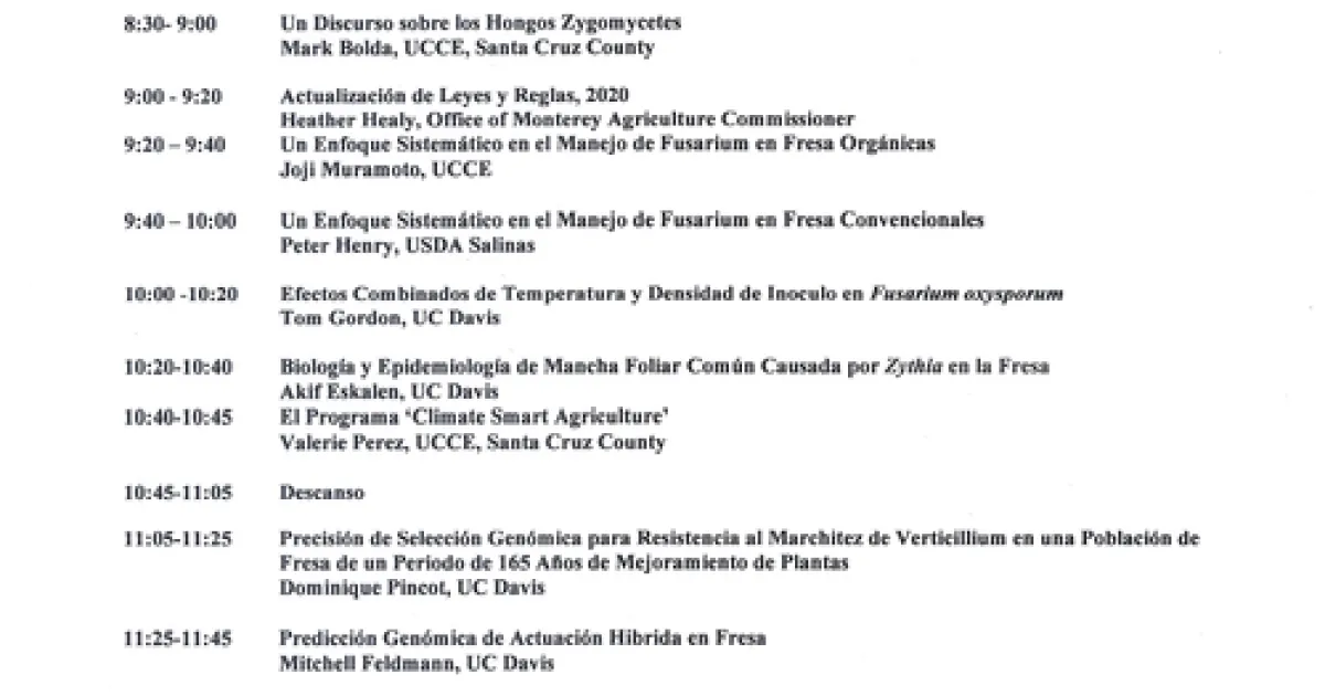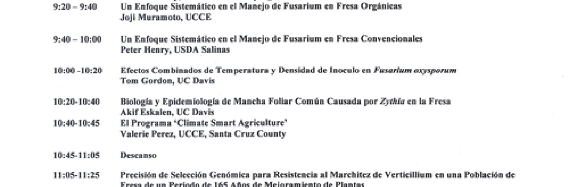 La reunión anual de investigaciones de producción de fresa tomará lugar este 5 de febrero en el Salinas Sports Complex en la 1034 North Main en Salinas.  Dese cuenta que el lugar este año NO está en Watsonville como en todos los años pasados.
