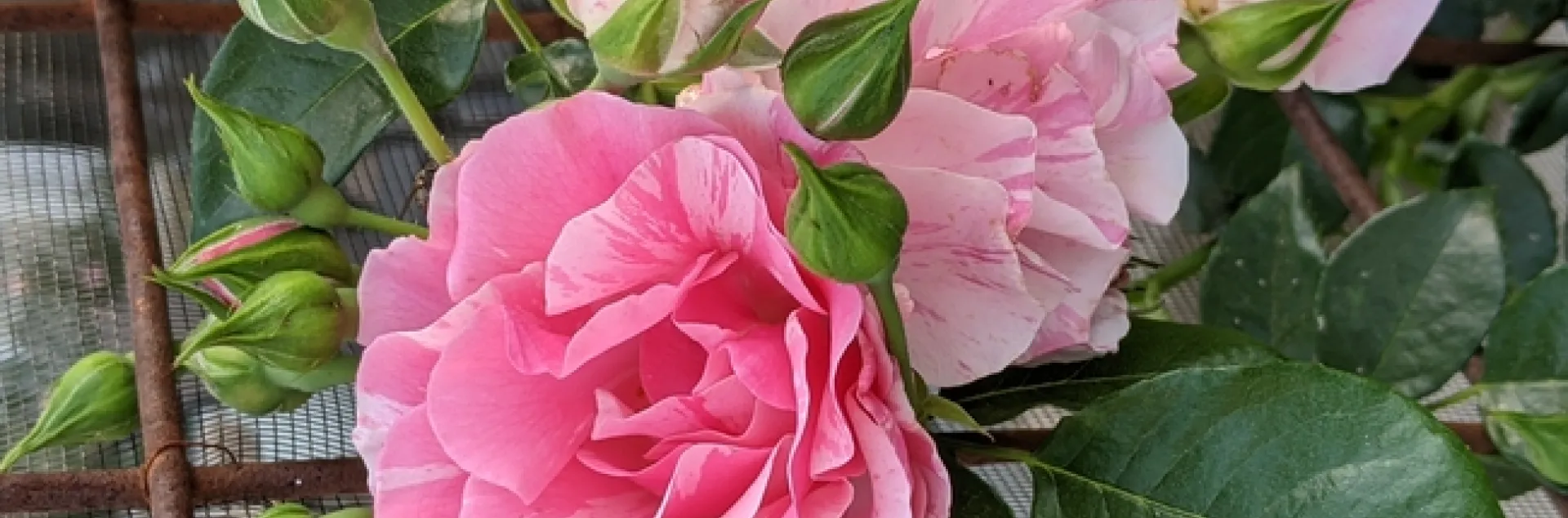 Earlier in the article, I showed you a climbing rose that had been pruned. Here is what it looks like in the spring. This rose, called Flamingo Dancer, is one gorgeous rose that tolerates our soil and weather conditions beautifully. It also makes a lot of hips in the fall (great for tea if you don't use insecticides). Because it's a semi-double flower rose, the bees find it irresistible. It's great for our pollinators! Flamingo Dancer was bred by Burling Leong, who has her own nursery in Visalia, Calif. Burling has bred several amazing roses. Her nursery is a beautiful place to visit. She worked for many, many years for the famous rose breeder Ralph Moore (whose nursery was also in Visalia).