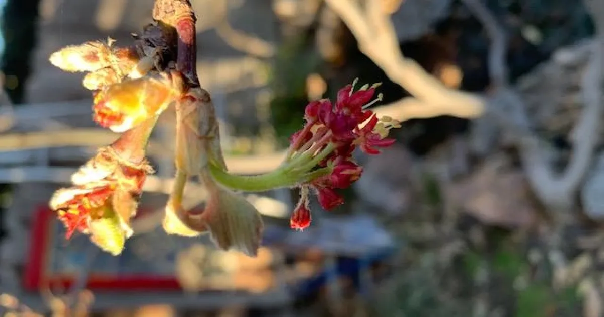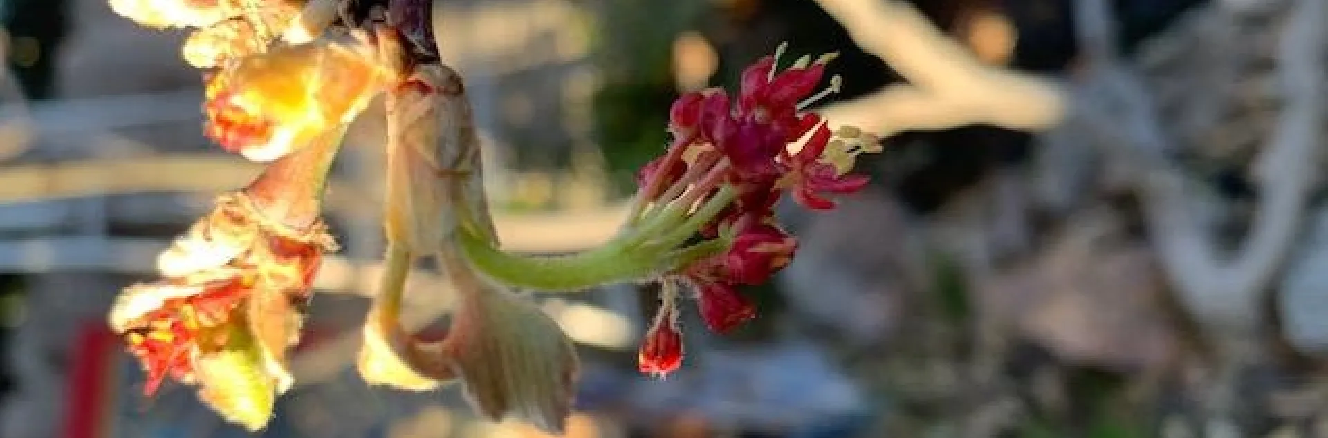 Leaves and flowers unfurlingThe earth turns, seasons change. Once again I watch with awe and delight as my garden comes alive after a short Central Valley winter nap. Invisible seeds dropped by plants and birds unfurl their first leaves (cotyledons), bare stems of perennials break the barriers at the growth points and begin the slow but sure process of filling out their form for the coming growing season, many ultimately producing flowers for visual delight, pollination, and reproduction. I pull the new weeds that appear everyday, mainly privets that pop up because the birds love the sweetness of the berries and defecate the seeds while in flight from one branch to the next. I wander the yard several times a day, every day, a habit bred through years of wandering our Midwest garden with my mother. I always thought it was a waste of time then, but have come to appreciate that every day brings new wonder.