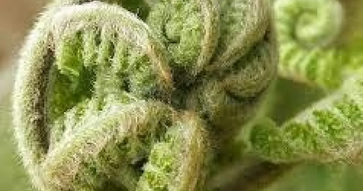 5. Circinate Ptyxis: Example: Ferns. New fern fronds are tightly wound spirals in the center of the fern. Each slowly rolls upward from the bottom to the top. This new growth is also called a fiddlehead. This careful unrolling allows the base of the frond to strengthen as the “basal lump” is exposed to light and begins photosynthesis. By rolling from the bottom up the tender tip of the frond is protected from weather and hungry animal eaters.