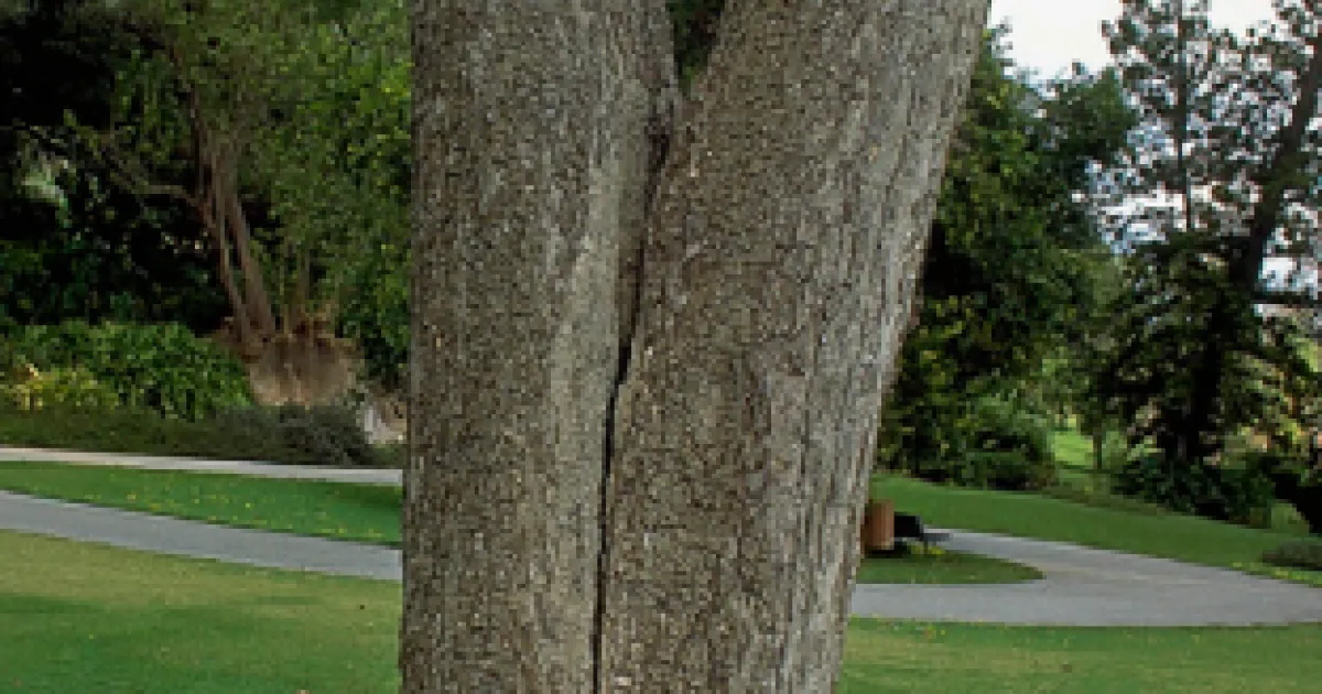 Multiple trunks: Some trees develop more than one trunk, which are often weakly attached and prone to splitting apart— especially those with narrow angles of attachment. This condition is a concern in large trees. Inspect the point where the trunks meet.