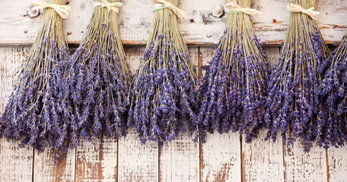 In order to make the essential oil, the lavender should be dried. The easiest way to dry lavender is to hang a bundle of stems (maybe 10-15) into a loose bouquet to ensure the lavender doesn't get moldy. Tie the base of the stems with twine, leaving one end longer for hanging. Hang it somewhere warm and airy to dry, out of the sunlight for a week or so. Check it for mold every few days.