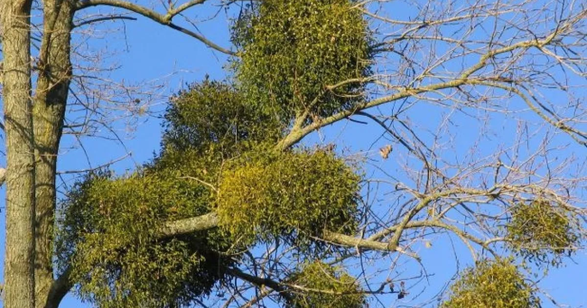 Leafy mistletoes have green stems with thick leaves that are nearly oval in shape. Plants often develop a rounded form up to 2 feet or more in diameter. The small, sticky, whitish berries are produced from October to December. Evergreen clumps of mistletoe are readily observed on deciduous trees in winter when leaves are off the trees. Mistletoe plants are either female (produce berries) or male (produce only pollen).