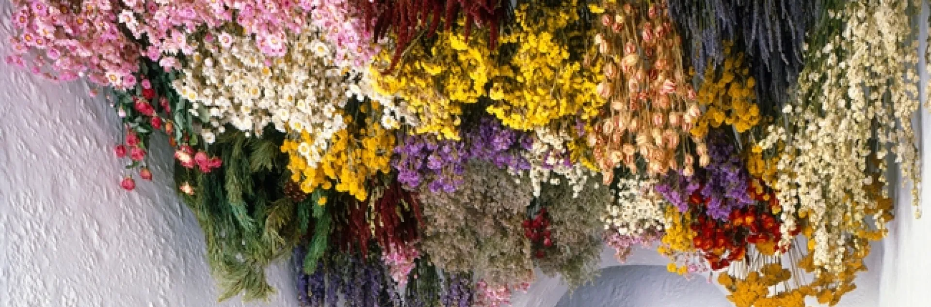 Air drying is the simplest method of preserving plant materials. The process is not an exact science and the actual temperature is not critical, though it should not fall below 50°F. A dry area with no direct sunlight and a small oscillating fan set on low is ideal. Some plant types are best dried upright with the stems loosely held in tall containers and the heads fanning out wide and away from each other. Hydrangea heads and gypsophila are two of the plant materials which can be air dried with their stems standing in a little water. As the stems gradually absorb the water it evaporates and eventually, over a week or so, the plant material dries more or less naturally. Other flowers and foliage may be dried horizontally spread out on racks or shelves covered with absorbent paper. Some plant materials do well hung upside down by their stems. Tie the materials into small bunches, with larger stems tied individually.