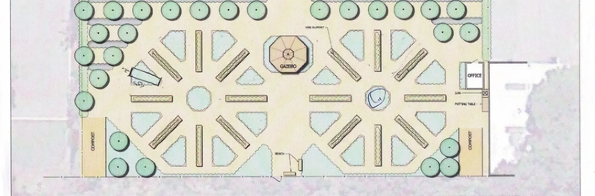 The 25,000+ square foot garden was originally designed by Registered Landscape Architect and Certified Arborist Jeff Gamboni. The original planting area of 16 raised beds was 768 square feet. The raised bed wheels are separated by a round gazebo which provides shade and park bench seating for garden workers and BHC employees. During the summer of 2019, each wheel received an additional eight raised beds increasing the total planting area to 1,728 square feet. The raised beds are watered via a drip system controlled by a new programable Raintree controller.