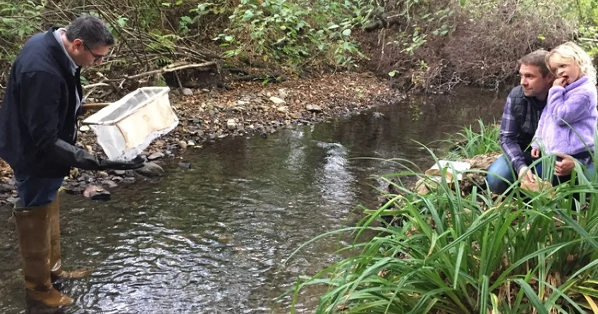 Igor Lacan, UCCE environmental horticulture and urban forestry advisor, scoops aquatic life from a stream on Elkus Ranch.