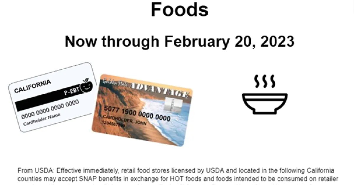 1) USDA Allows Hot Food Purchases with SNAP/CalFresh/EBT (food stamps) now through Feb 20, 2023 in select counties.