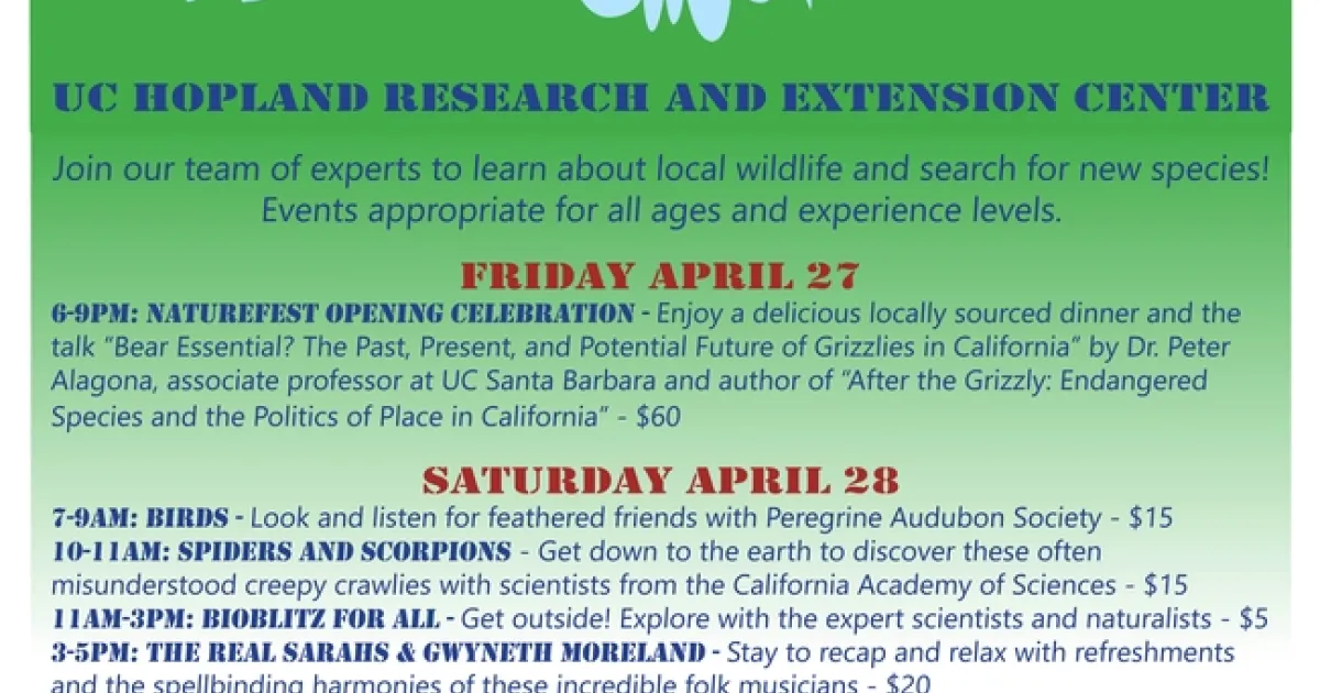 Spring is here, flowers are blooming and wildlife abounds. The UC Hopland Research and Extension Center (HREC) is inviting the community to join NatureFest on April 27 and 28 to revel in the joys of the outdoors!