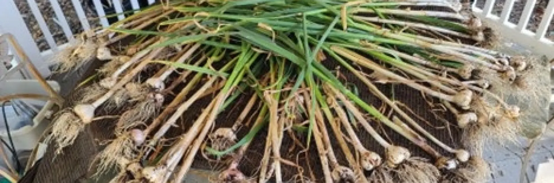 The first of June watch for the lower leaves of the garlic to begin to turn yellow. This is an indication that harvesting is close. For hardneck garlic look for 40-50% of the leaves to turn yellow. For softneck garlic look for 1/3 of the leaves to turn yellow. Dig up a few sample garlic bulbs and check to see if the bulbs have a uniform shape with good sized shoulders. If they are not ready, give them another week or two. When the bulbs have reached full size stop watering for a week to give the bulbs a chance to harden off a bit before harvest.