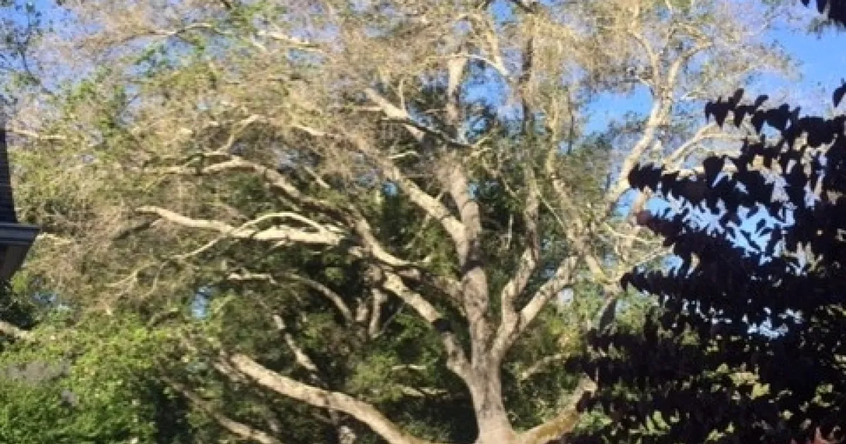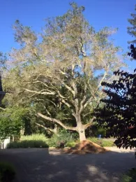 Help Desk Response: Thank you for contacting the UC Master Gardener Program Help Desk with your question about your oak tree. First off, let me say that I am sorry about your oak tree. It does not look very healthy in the picture you provided. While it is common for live oaks to shed significant leaves in the spring, it sounds like you are seeing a more general decline over years which is likely due to other causes. I also should note that our advice is based solely on the picture, as opposed to the arborist who come to your house and personally reviewed the tree on-site. Their advice is likely to be more accurate. You mentioned that they want to treat the tree yearly with a fungicide. Did they actually diagnose a fungal disease?