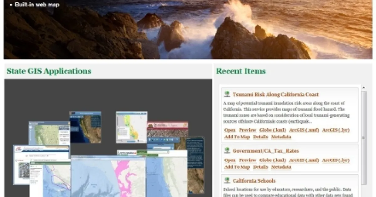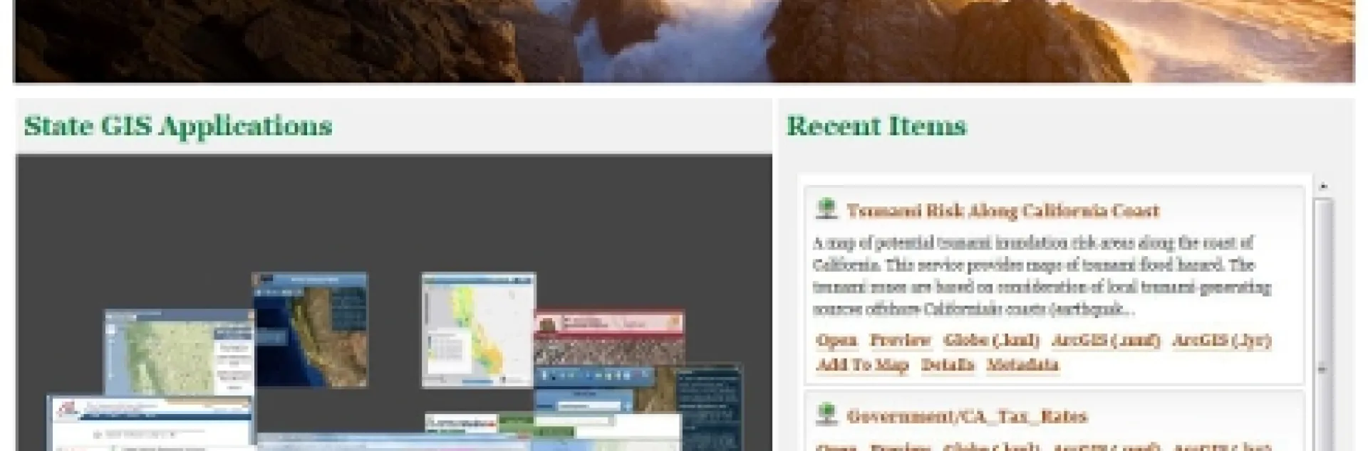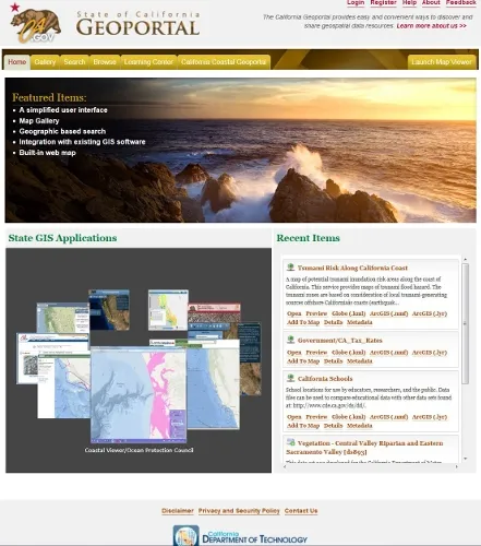 The California Geoportal, officially launched in March 2013 (see here for related launch press release), augments and in some ways replaces the original Cal-Atlas statewide GIS data download webpage with a more simplified, smooth, and more intuitive website for all GIS related data in the state. You can now search or browse for GIS data by geography and any corresponding metadata using traditional search queries as well as by using a standalone webGIS interface. The portal also provides direct download links to some Oregon and Nevada state GIS datasets. The site acts as a GIS data repository for publicly available GIS data and related documents and maps from state agencies and local and regional governments. Rather than hosting the physical data, the site instead acts as a library of direct download links to datasets that connect directly to the author’s databases. The site also links you to other state GIS applications such as the California Coastal Geoportal and webGIS viewers from various state agencies.