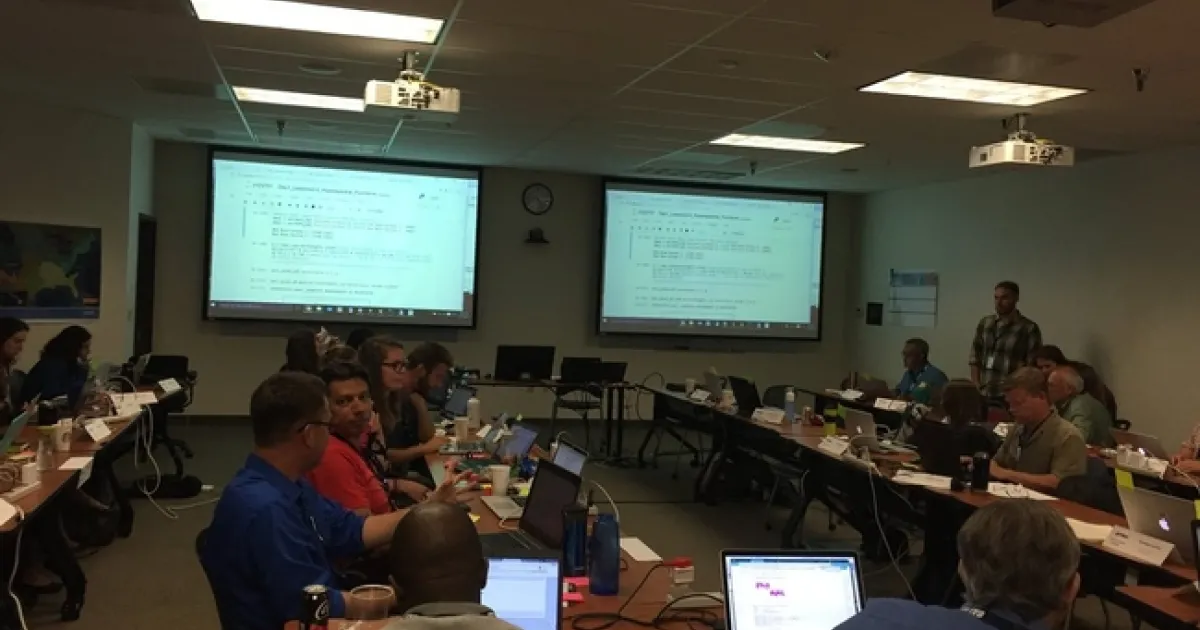 The afternoon focused on Lidar (yay!) and prior to coding we talked about discrete and waveform data and collection, and the opentopography (http://www.opentopography.org/) project with Benjamin Gross. The opentopography talk was really interesting. They are not just a data distributor any more, they also provide a HPC framework (mostly TauDEM for now) on their servers at SDSC (http://www.sdsc.edu/). They are going to roll out a user-initiated HPC functionality soon, so stay tuned for their new "pluggable assets" program. This is well worth checking into. We also spent some time live coding with Python with Bridget Hass working with a CHM from the SERC site in California, and had a nerve-wracking code challenge to wrap up the day.
