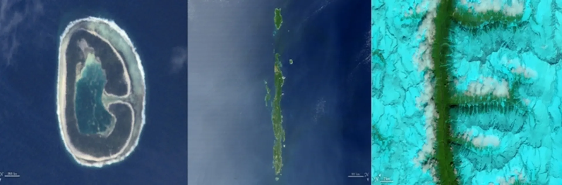 - I: On February 10, 2007, the Moderate Resolution Imaging Spectroradiometer (MODIS) on NASA’s Terra satellite captured this image of the Andaman Islands. The thin, bright rings surrounding several of the islands are coral reefs that were lifted up by a massive earthquake near Sumatra in 2004.