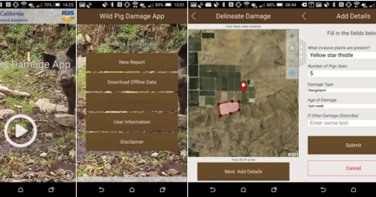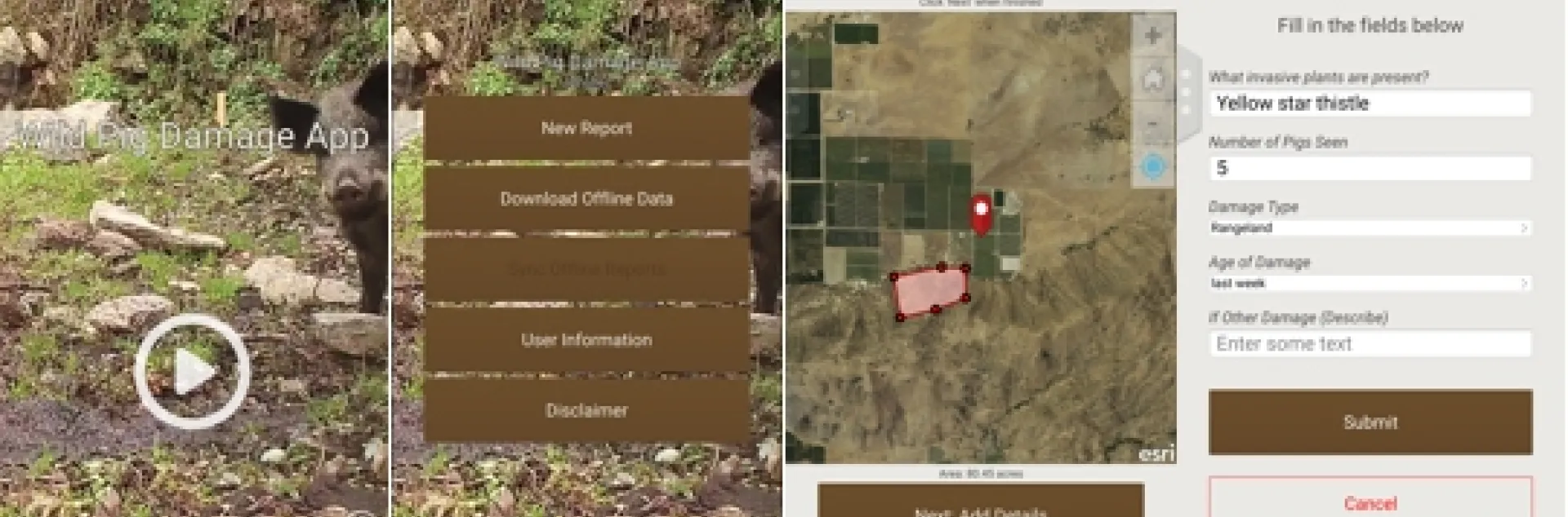 Description of the App: The UC ANR's University of California Cooperative Extension and Informatics and GIS Program have developed a GIS-based mobile application for Apple and Android devices that will collect wild pig damage on range, forest and agricultural lands over time. By taking at least three locations the app will map acreage and geographic location of wild pig damage reported by the users. Cell service at the site is not required to collect data.