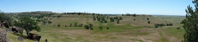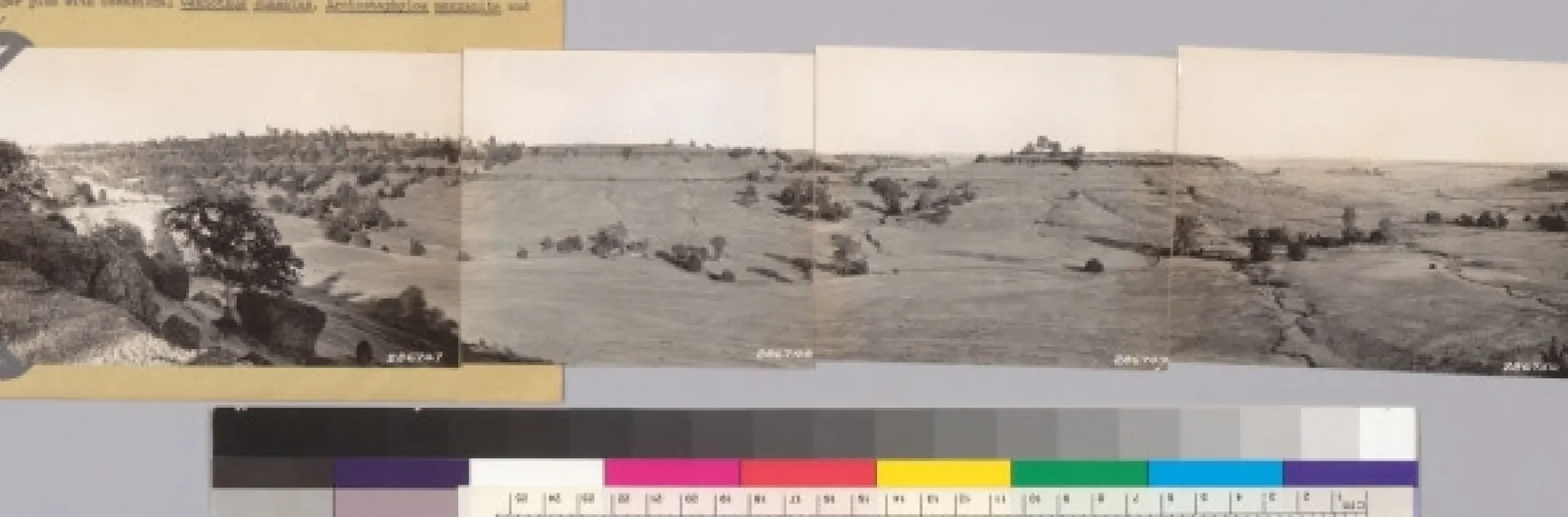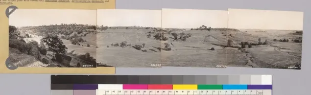 "Butte County. Panorama looking SW, S. SE and E from Neal Road. Note Juniperus californica in ravine. Woodland grass type of blue oak and digger pines with occasional Ceanothus cuneatus, Arctostaphylos manzanita and Rhus diversiloba."