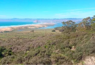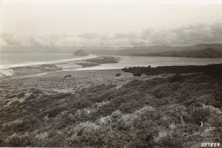 Date of original photo: Feb 25, 1936, taken in San Luis Obispo County, California, US. Looking north toward Morro Bay. Shows almost dense stand of Arctostaphylos morroensis in foreground. Quad name: Cayucos. Quad number: 132B. Reference to map: 1. Photographer: Albert Wieslander.