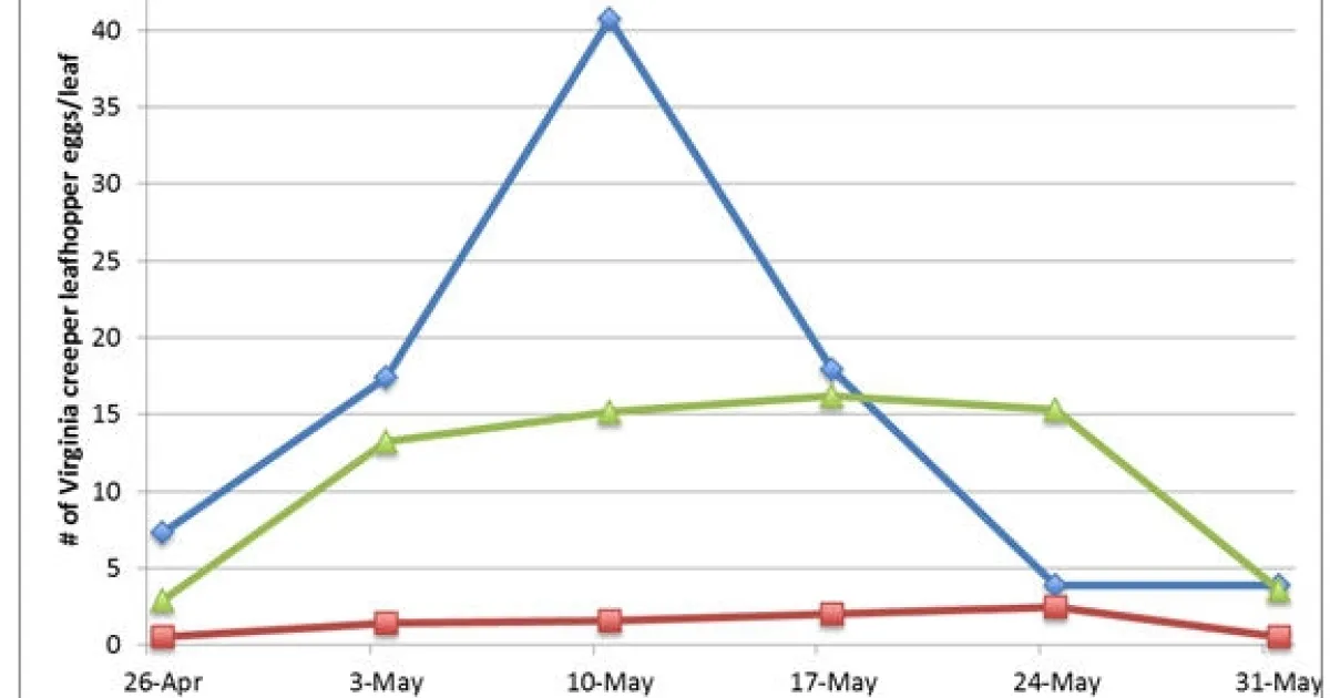Virginia creeper leafhopper and Western grape leafhopper continued laying eggs on basal leaves (see Fig. 1 & 2), although peak egg laying has passed. Monitoring efforts during the week of May 14th showed the first emergence of VCLH nymphs for the season (see Table 1 for # VCLH nymphs per leaf for May 24 & 31). We are observing nymphs between 1st and 3rd stage instars, an ideal target stage when spraying with an oil. Nymph emergence and development will continue in the coming weeks, so now is the time to be monitoring nymph populations in your vineyards.