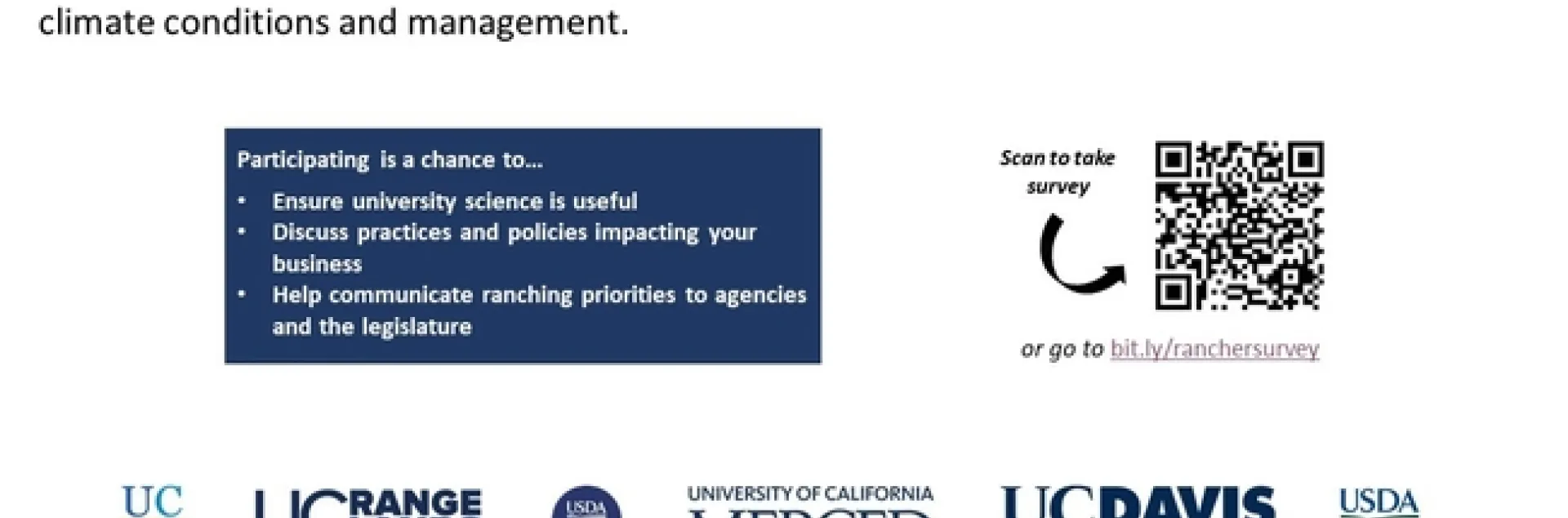 We invite you to participate in a survey about California ranchers' and farmers' concerns, perceptions, information, and education needs related to changing climate conditions and adaptation. This survey is part of a research study funded by USDA National Institute of Food and Agriculture and conducted by researchers at UC Cooperative Extension, UC Davis, and the USDA California Climate Hub. Survey results will be used to develop extension and education programs for farmers and ranchers.
