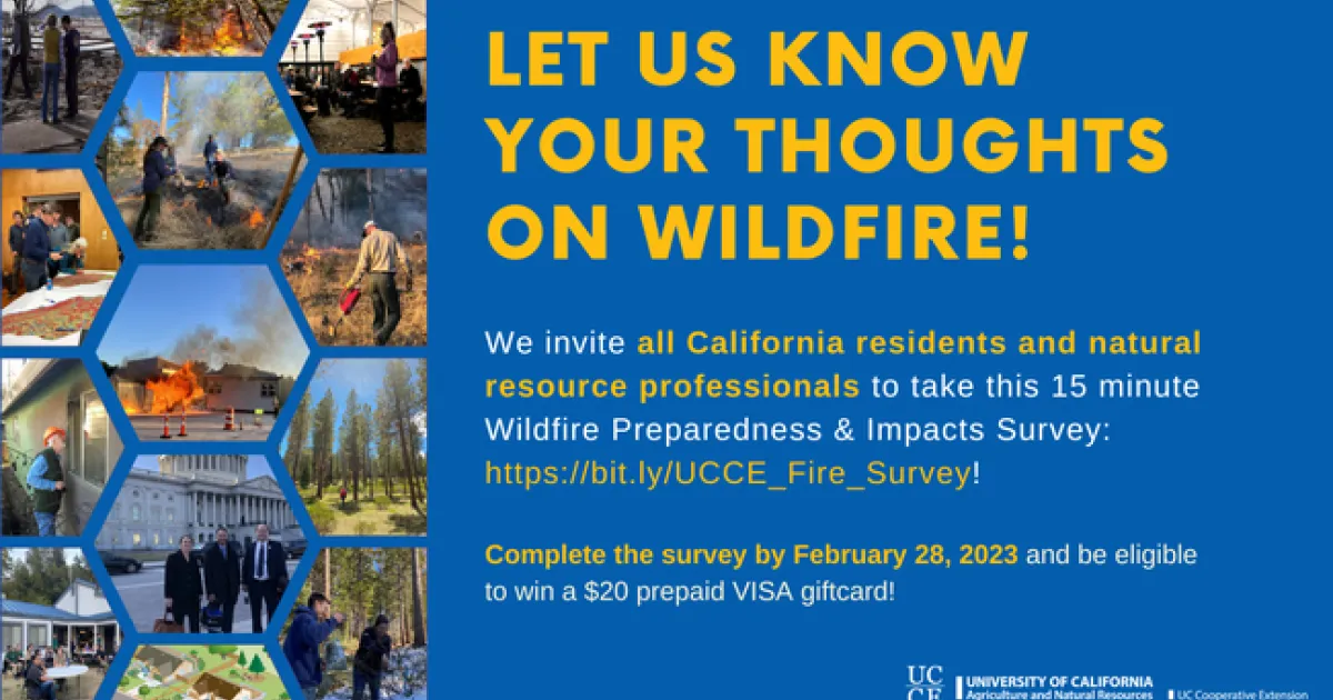February 2, 2023By Devii R Rao Print A team of new UCCE Fire Advisors would like to hear from you about your needs related to fire. Please click this link if you'd like to provide them with guidance as they develop their research and education programs.