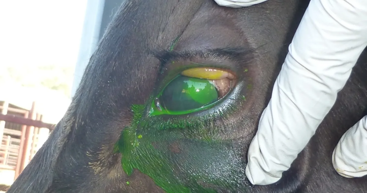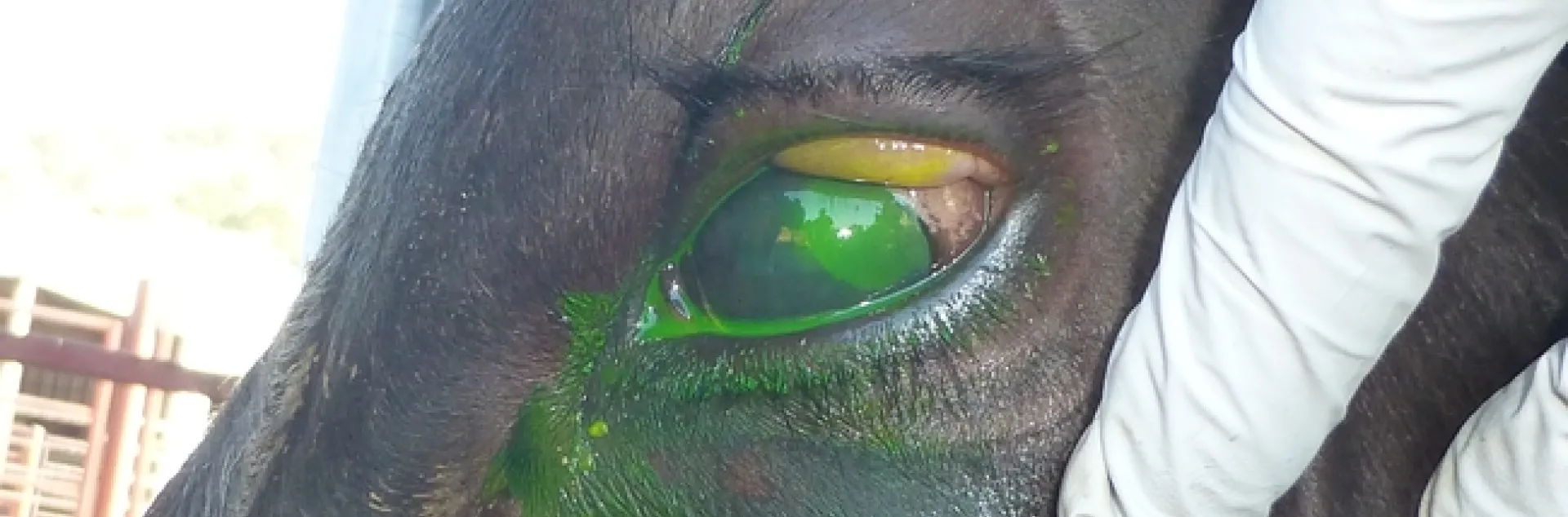 You may also encounter eyes that look like a developing pinkeye, when really they have already begun the healing process. Consider Figure 1, which shows an eye from the same cow on 5/22/12 and 6/5/12. This animal was not treated with antibiotics. The green color is fluorescein, which is a dye that is added to the eye to better identify corneal ulcers associated with pinkeye. On 5/22/12 the animal showed a typical ulcer (area in green); by 6/5/12 the eye had begun to heal. If you came across this animal on 6/5/12 on the ranch, however, you wouldn't have the benefit of knowing the trajectory of the eye's healing process. While antibiotics would not be necessary, it would be difficult to know not to apply them. One important indication that the eye is already healing (and thus does not require antibiotics) is the presence of red blood vessels covering the cloudy part of the eye (see 6/5/12 photo from Figure 1). Other indications that an eye is well on its way to healing and may not need antibiotics is if the eye is not excessively teary or weeping and if the animal is not actively squinting or sensitive to light.