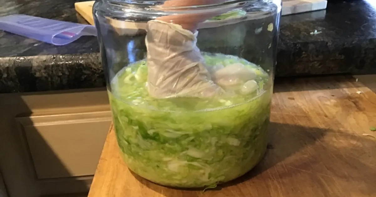 Continue packing the cabbage into your container pushing down to extrude the juice. Once you have finished packing the container, you should have at least 1-2 inches of brine covering your cabbage. If there is not enough liquid, add some of the prepared brine you made ahead to your container until you have adequate coverage. It is critical your cabbage is fully submerged under your brine. This will help prevent spoilage from mold and other microbes from invading your product.