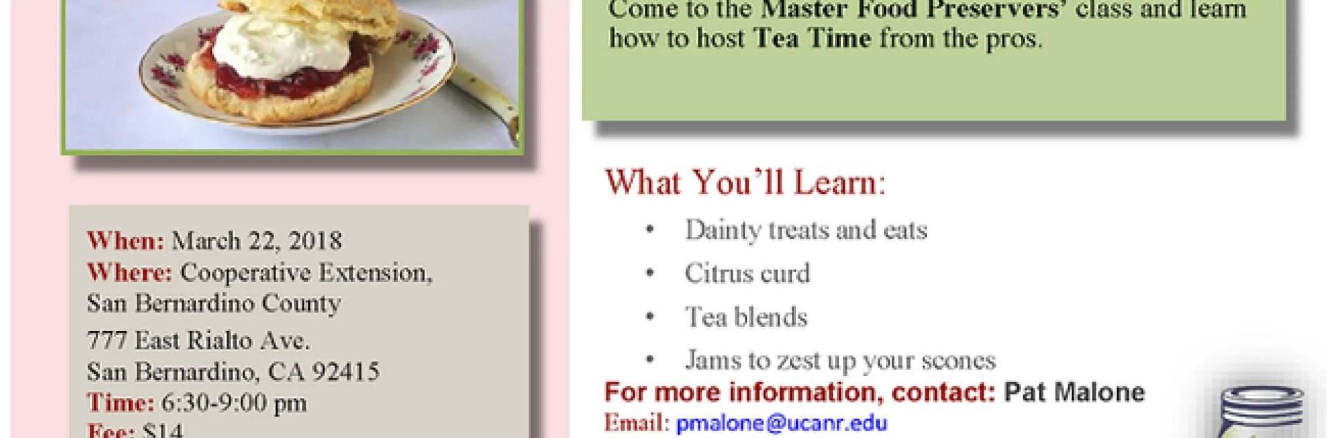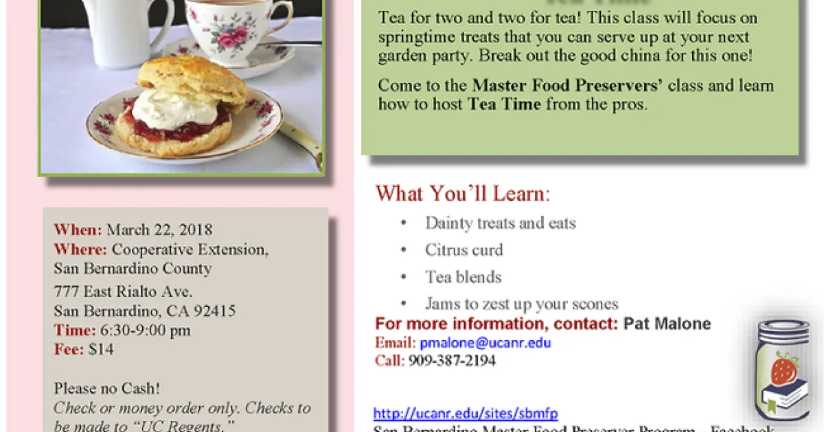 February 6, 2018 Print Attend and make this class your cup of TEATIME. Teas come in all sorts, and there many things to have with your teas. Learn about Teatime. . .