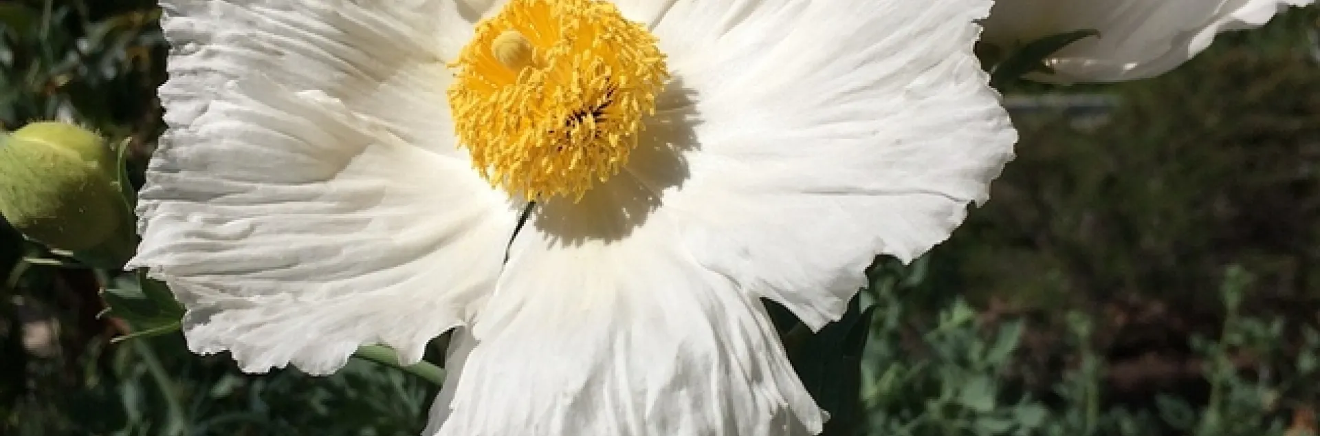 This shrub can grow to more than eight feet tall and just as wide. It has blue-gray leaves and flowers that are six to eight inches across—the largest blooms of any California native. The petals look like white silk crepe and are arranged around a fluffy yellow center, giving the appearance of a sunny-side-up egg. A large shrub covered with these blooms in early summer is a showstopper in any garden.