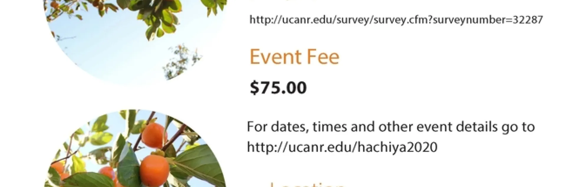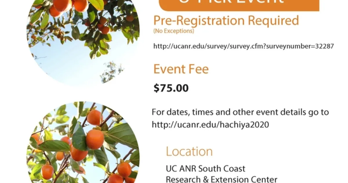 Looking for some outdoor fun and fresh fall fruit? Join us for one of the 2020 Persimmon U-Pick event sessions being held on Tuesday November 3rd, Friday November 6th, and Tuesday November 10th. Limited space available - pre-registration required.