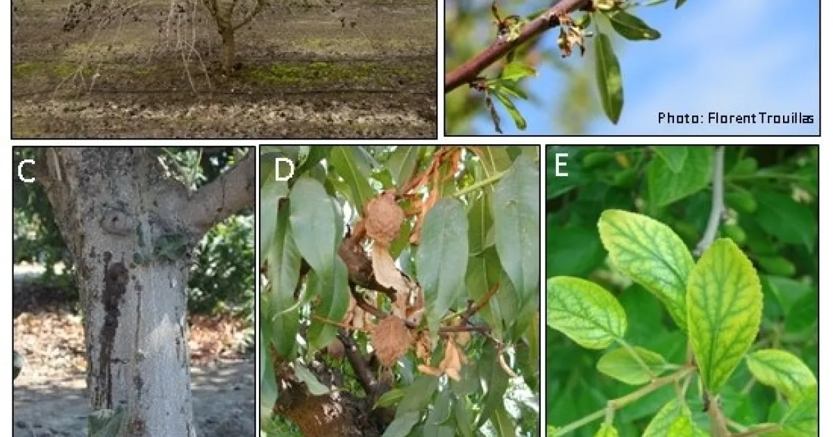 Orchards that have sustained flooding may be physiologically impacted by roots persistence in anoxic conditions and may also be exposed to waterborne plant pathogens. Over time saturated soil will become depleted of oxygen by the roots and microbial communities resulting in anoxic conditions that can lead to root mortality. The extent of damage to the roots may not be realized until the season progresses, and root damage may manifest with general canopy decline and anchorage issues. Many of the tree crops grown in California are grafted onto disease resistant rootstocks. If flood water rises above the graft union, the benefit of these rootstocks is largely negated. Many rootstocks have been selected over time for resistance to Phytophthora spp., a group of soilborne pathogens that create motile spores that swim at the water surface. These pathogens are common in surface water, and incite canker diseases, particularly when the water level persists above the graft union. Symptoms of infection include general canopy decline and cankers, many of which ooze or ‘bleed' (Figure 1C). The full suite of symptoms may not manifest until further into the growing season when the heat imposes stress on the trees.