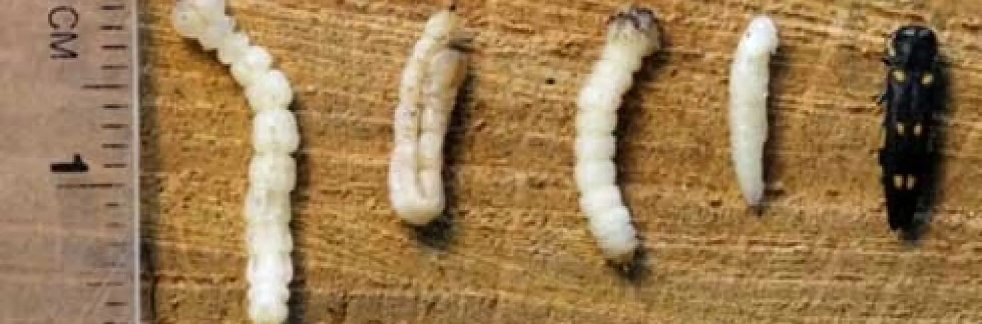 Life states of the goldspotted oak borer.  From left: fourth-instar larva, fourth instar larva in a hairpin configuration and in a constricted form, pupa and adult.  Photo by Mike I. Jones