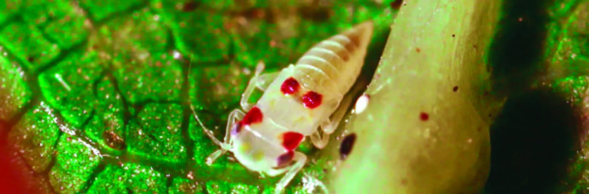 Nymph of the Virginia creeper leafhopper (VCLH), Erythroneura ziczac.  It is a new invasive pest on grapes.