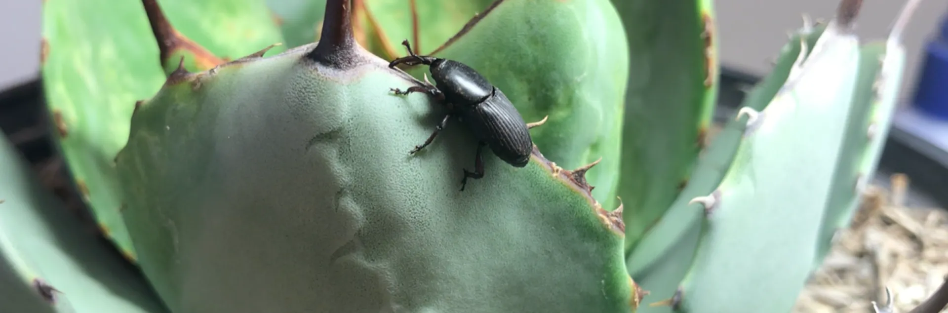 Agave snout weevil (Scyphophorus acupunctatus) is a serious pest of agave that can rapidly kill plants. Adults bore holes into the base of agave plants and lay eggs that hatch into larvae. The larvae feed on the plant, tunneling into the base and destroying roots and other tissue. Larval feeding and secondary infections that develop within larval feeding wounds usually kill affected plants. Many kinds of agave are susceptible, including full grown Agave americana.
