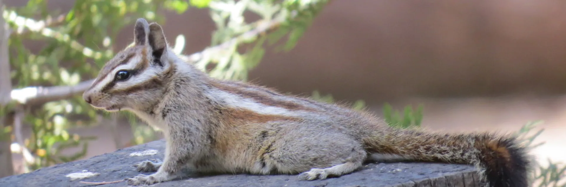 A light brown rodent with black and white stripes around it's eyes and a bushy tail sitting on a tree stump.