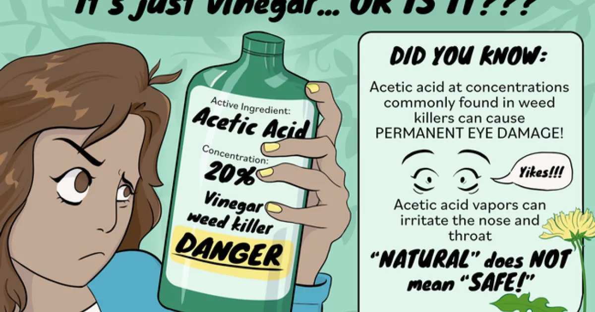 Acetic acid, also known as vinegar, is used in products for weed control. Many people choose it because it is natural. However, acetic acid can damage skin and eyes, especially at concentrations commonly found in weed killers.