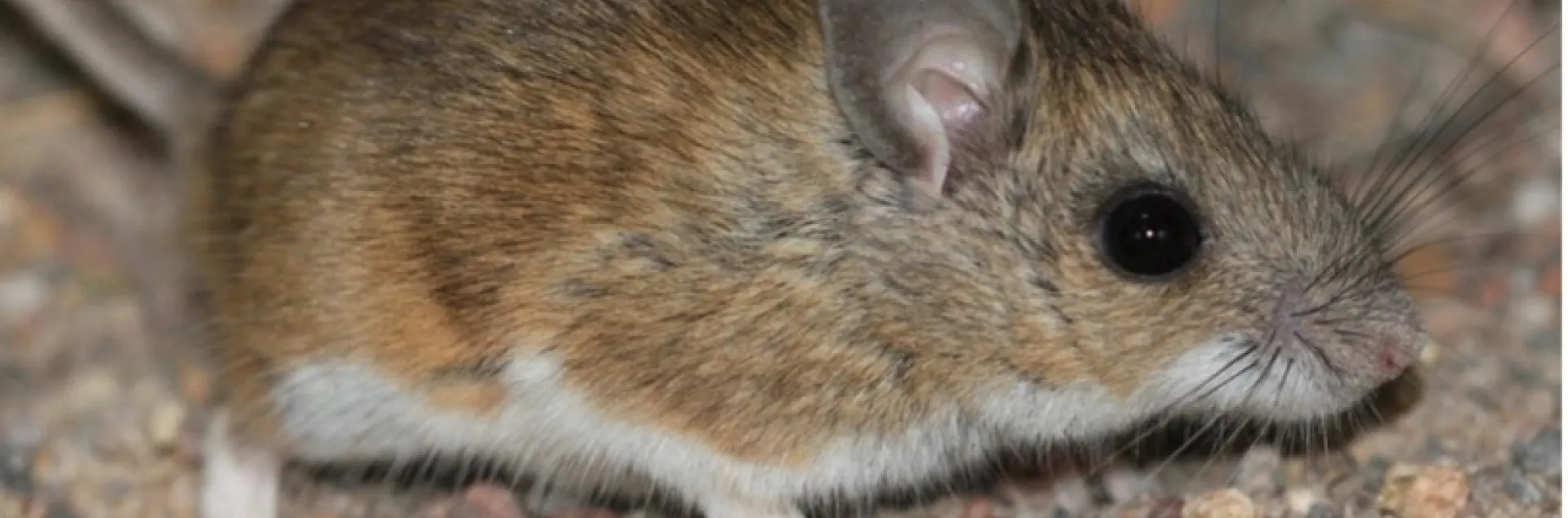 Deer mice, Peromyscus maniculatus, are the most abundant and widely distributed mammal in North America. They look similar to the house mouse, Mus musculus, but can be distinguished by their bicolored tail, larger eyes, and white undersides.