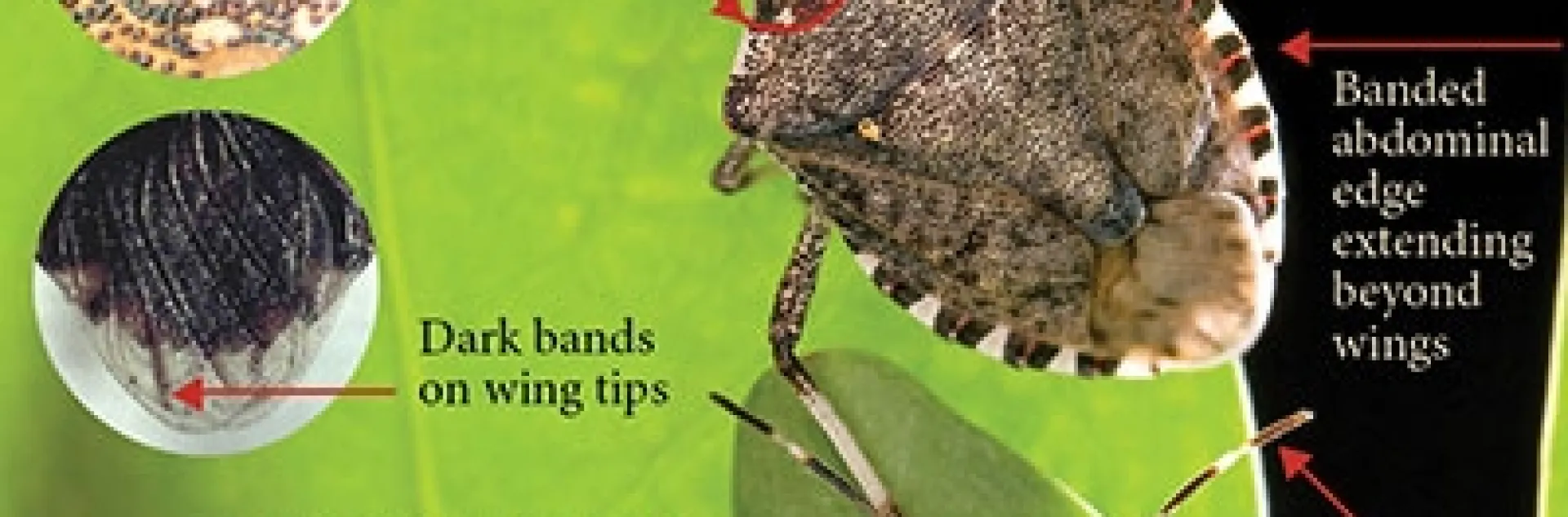 The adult BMSB is a shield-shaped stink bug, about 5/8 inch long, and marbled brown. It can be distinguished from other similar stink bugs by the characteristics shown in Figure 1.
