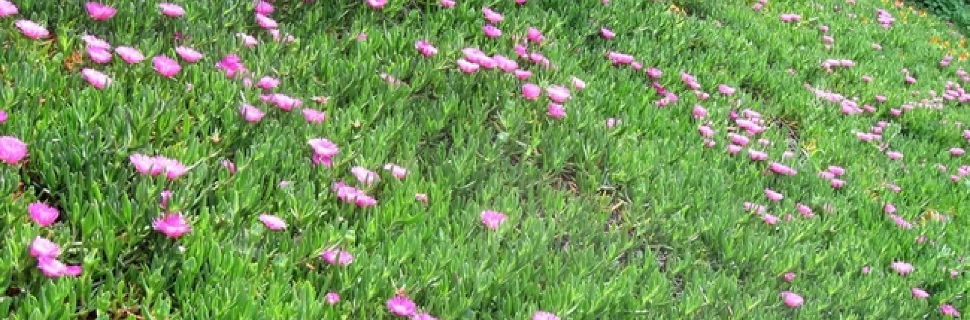 The highway iceplant, also known as the hottentot fig, is a succulent with fleshy three-sided stems. It grows as dense ground-covering mats and produces large yellow to light pink flowers in the late spring and early summer.