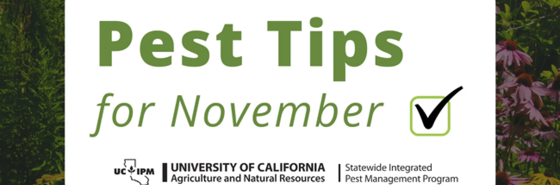 Rainy, cool weather is fast approaching for many parts of California. To help you determine what to do in the landscape during this time of the year UC IPM offers a Seasonal Landscape IPM Checklist. The online checklist provides monthly pest management to-dos for your region so you can prevent pests and their damage in the garden and landscape.