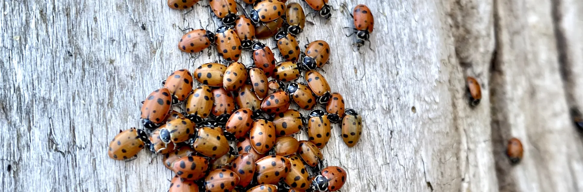 There are about 200 species of lady beetles in California, varying in color, size, and diet. Most are predators of pest insects as both adults and larvae. Some species feed primarily on aphids, while others are specialized to feed on scales, mealybugs, and even fungus! Lady beetles sold commercially in California are convergent lady beetles, Hippodamia convergens. They are named for the converging white lines on their thorax. Suppliers collect the lady beetles from their overwintering sites in California's foothills and mountains to sell in nurseries and garden centers.