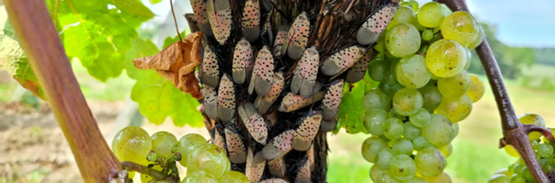 Figure 1. Spotted lanternflies on grapevines. Photo Credit: Heather Leach, Penn State University.