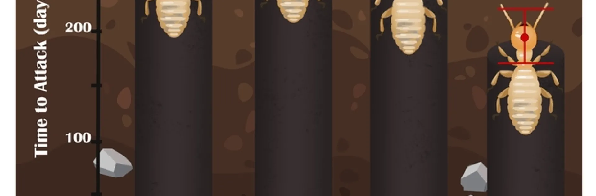 Our study's main question was whether installation season significantly impacts “time-to-attack” due to seasonal differences in termite foraging in California. To answer this, we pooled data from all five sites and all three bait systems and then considered just the first year of observations. The result was clear: baits installed at the beginning of winter (December 16) were intercepted ~100 days faster than baits installed at the beginning of summer (June 24)!
