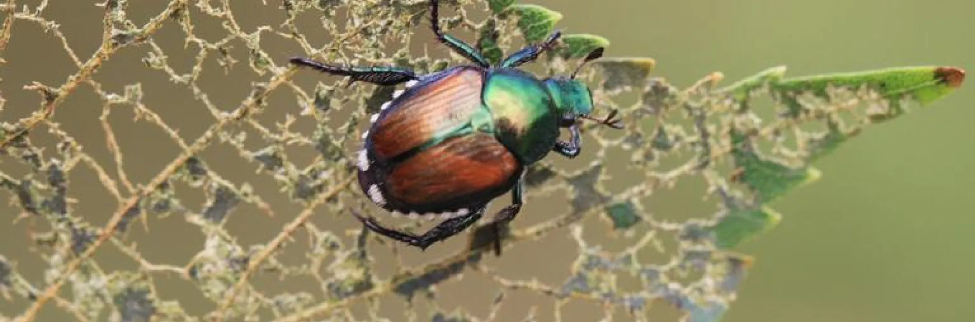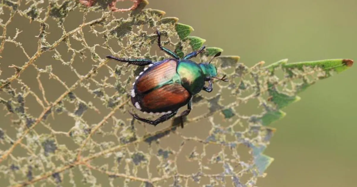 A shiny green and bronze beetle on a heavily damaged leaf.