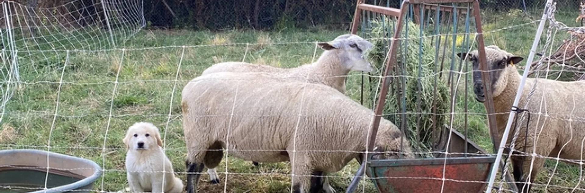 As soon as the puppy was left with the rams, he promptly decided that he could get through the bottom section of the electro-net - even though he got shocked. But imagine all of this from the pup's point of view. In one day, he was separated from his siblings and mother, had his first experience in a dog crate and in a moving vehicle, only to arrive at another farm where there were sheep, chickens, horses, mules, and other dogs. I suspect he was a little overwhelmed! We needed to get a little creative.