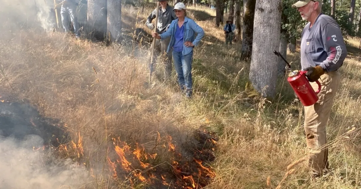 Chris Paulus and rancher Carol Kramer burning barb goatgrass in July 2023.