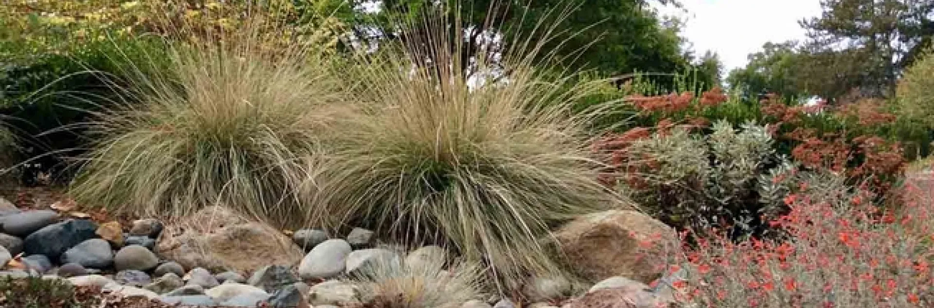 Anchor your artificial creek bed with larger stones, boulders, and deep-rooted plants such as deer grass (Muhenbergia rigens) and fescues (Festuca species). If space permits, larger shrubs can create a more dramatically varied look. Vegetation should be planted and at least partly established before the winter storms, so be prepared to irrigate in dry periods and through at least the first summer. Once well established, deep-rooted native plants will enjoy the cool season storm water and survive the summer heat.